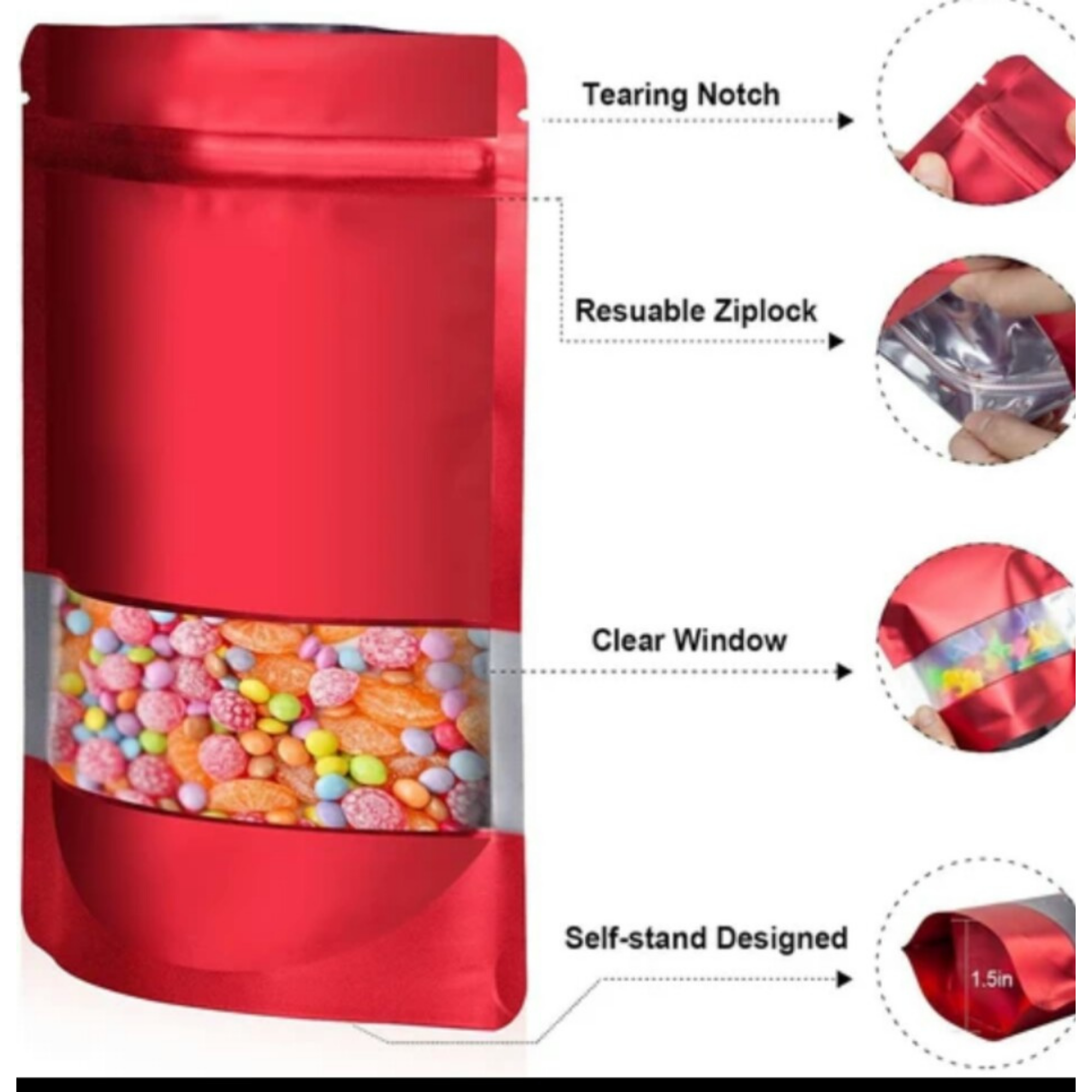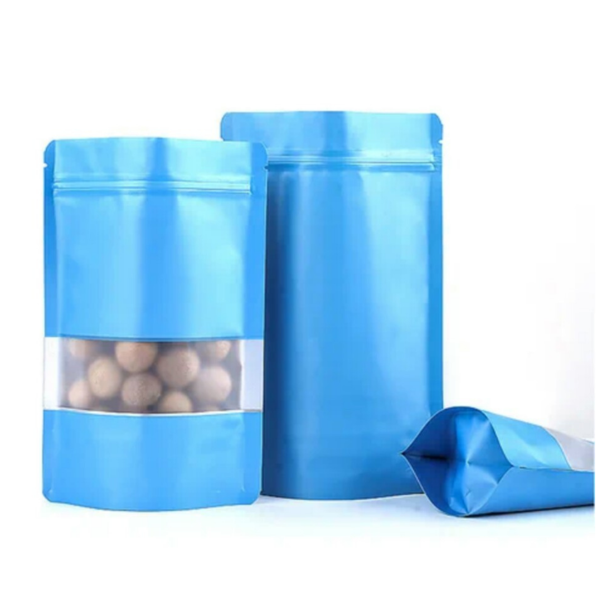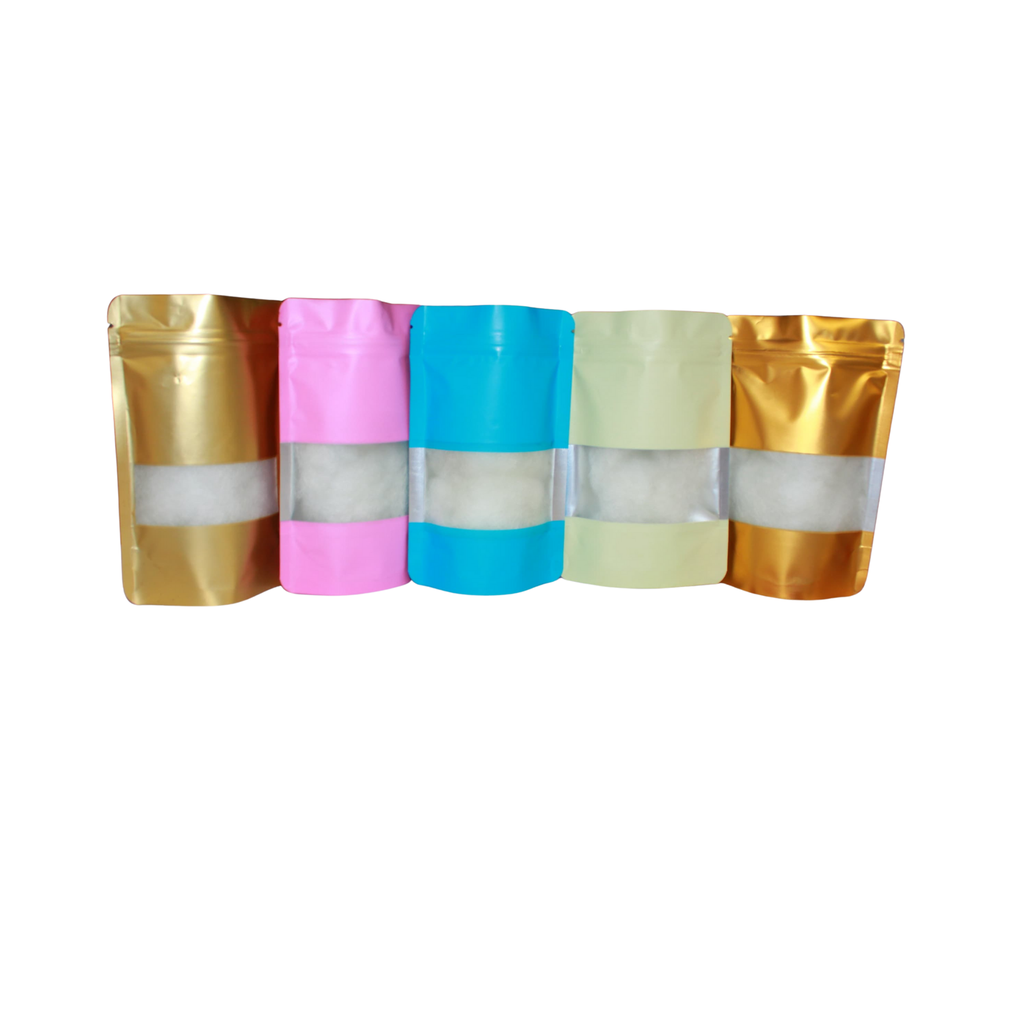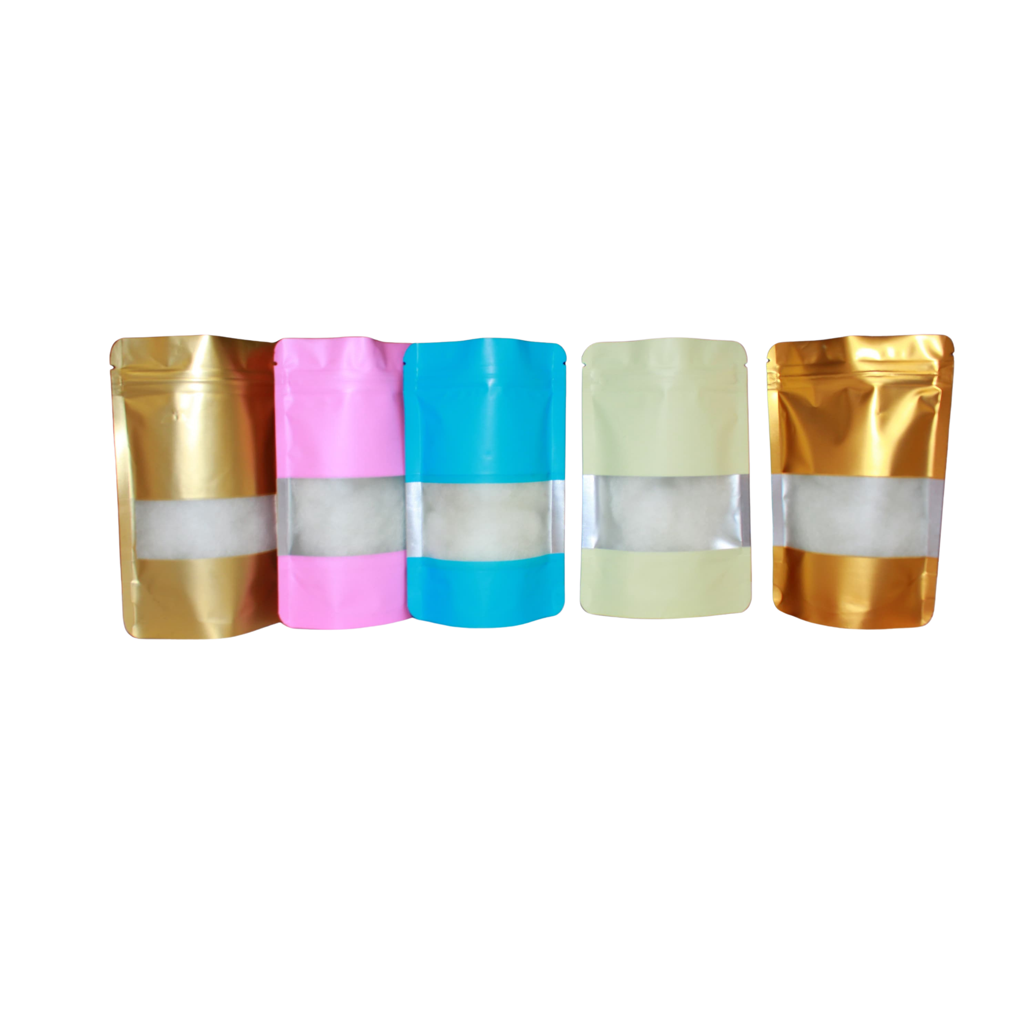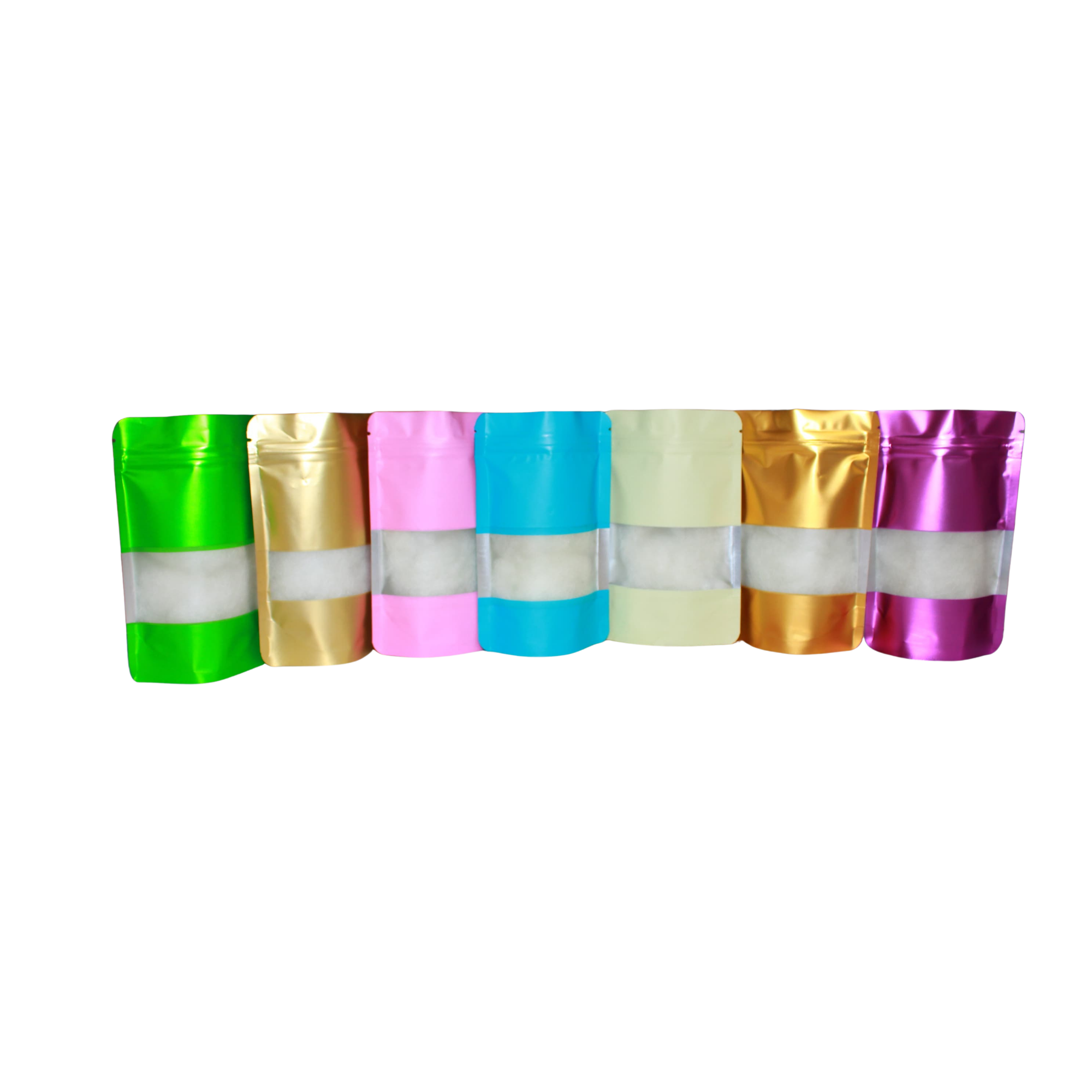 Colored Resealable Aluminium Ziplock Bags combine style and function with a matte finish, clear rectangular window, and self-standing design. Made from food-grade material, they feature a tear notch for easy opening and a reusable ziplock closure for freshness and sustainability.